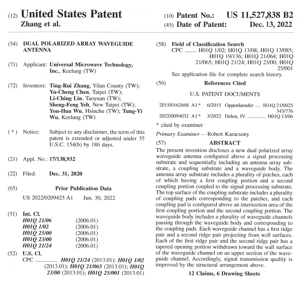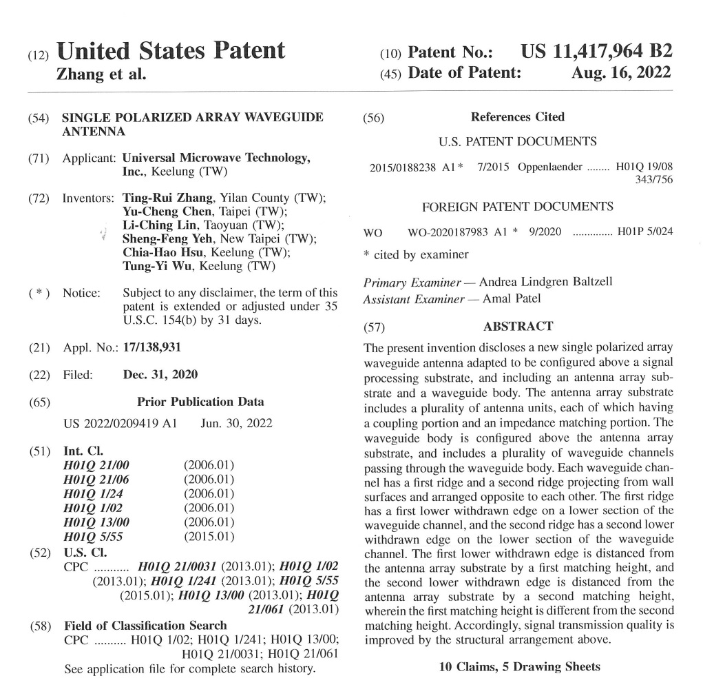 UMT obtained the Single Polarized Array Waveguide Antenna Patent in USA on October 2022. Subsequently, we obtained the Dual Polarized Array Waveguide Antenna Patent also in USA on March 2023.