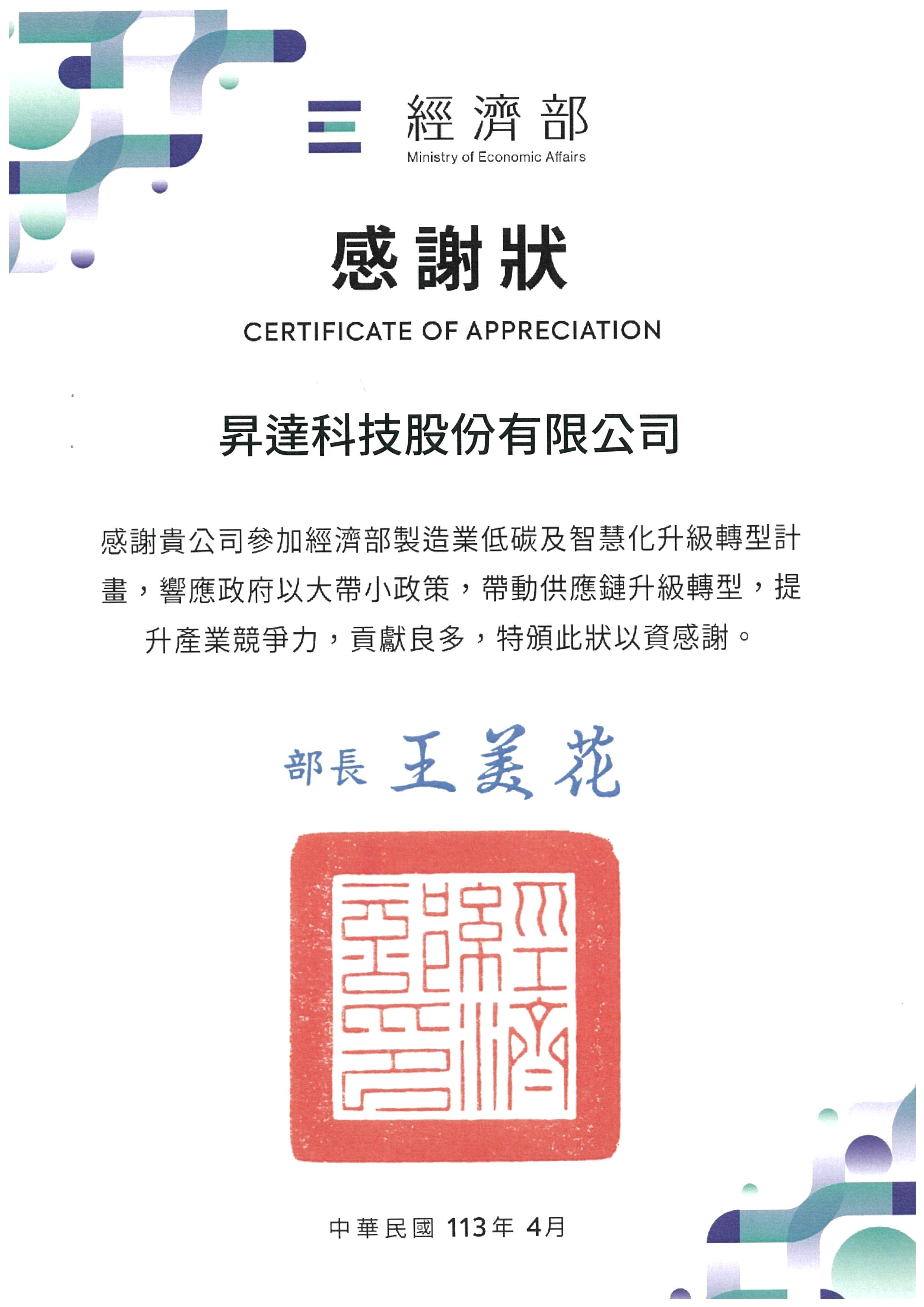 UMT in corporation with supply chain to promote industrial upgrade and obtains a Certification of Gratitude from the Ministry of Economic Affairs