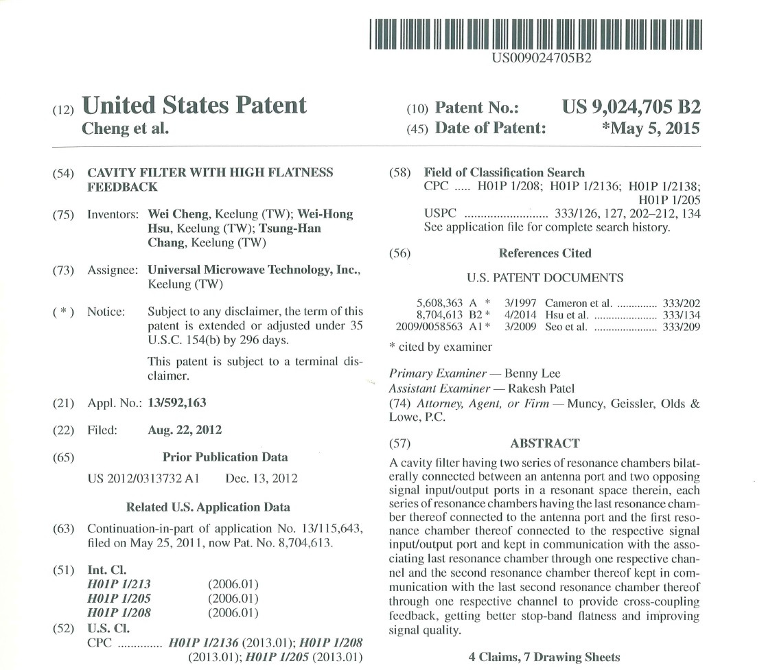 UMT Obtained the Cavity Filter with High Flatness Feedback Patent in USA