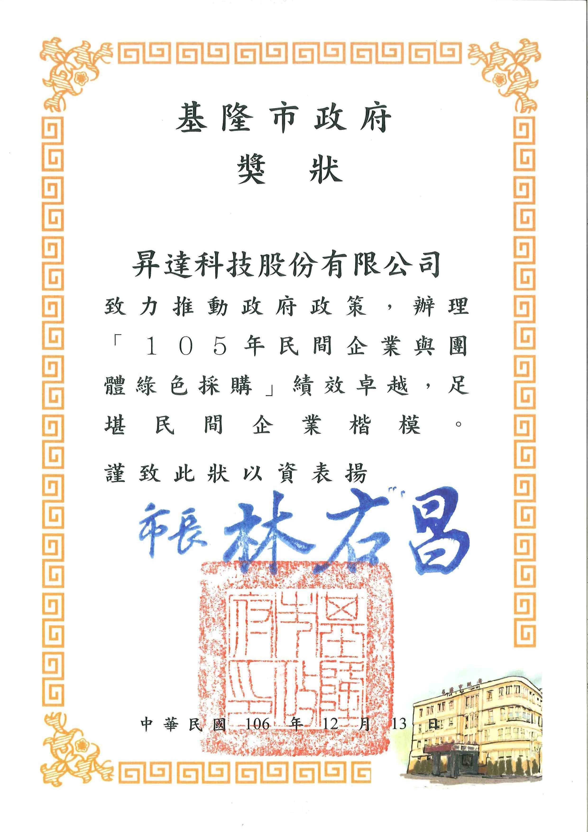 UMT Obtained "2016 Green Procurement Performance Excellence Award" from Keelung City Office.