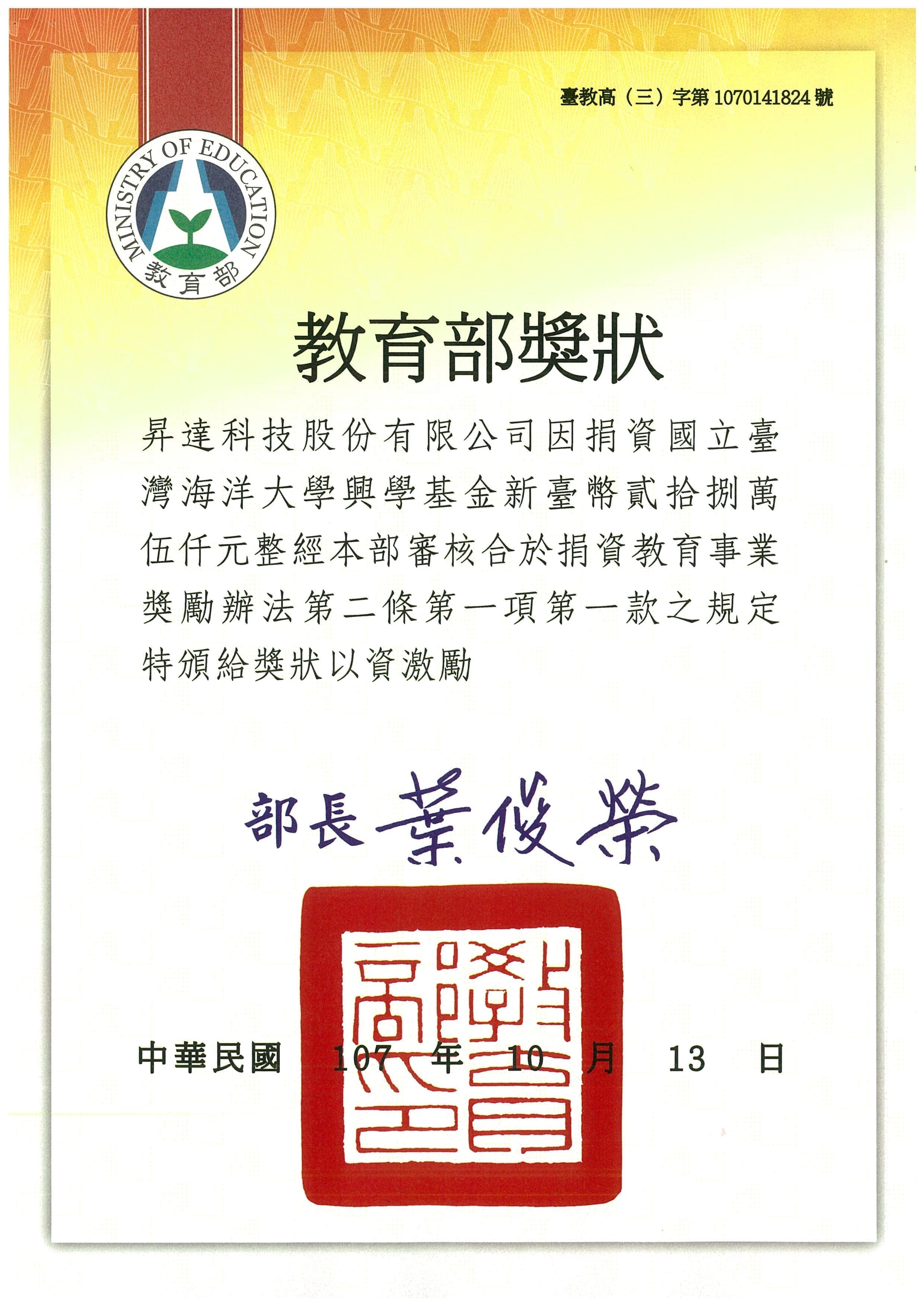 Donation of NT$125,000 to National Taiwan Ocean University for educational purposes. UMT was awarded by the Ministry of Education for this donation.