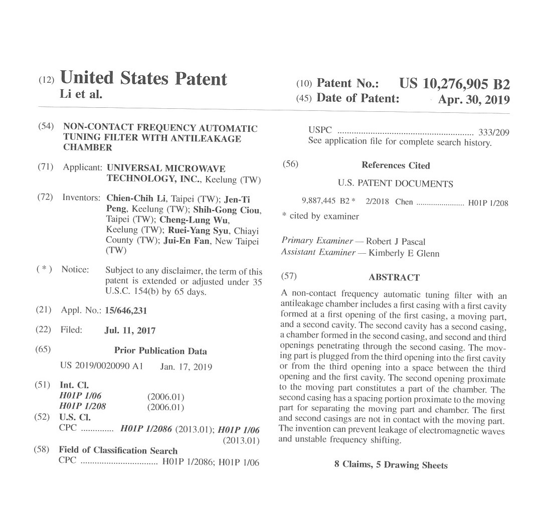UMT has obtained US Patent for Non-Contact Frequency Automatic Tuning Filter With Antileakage Chamber.