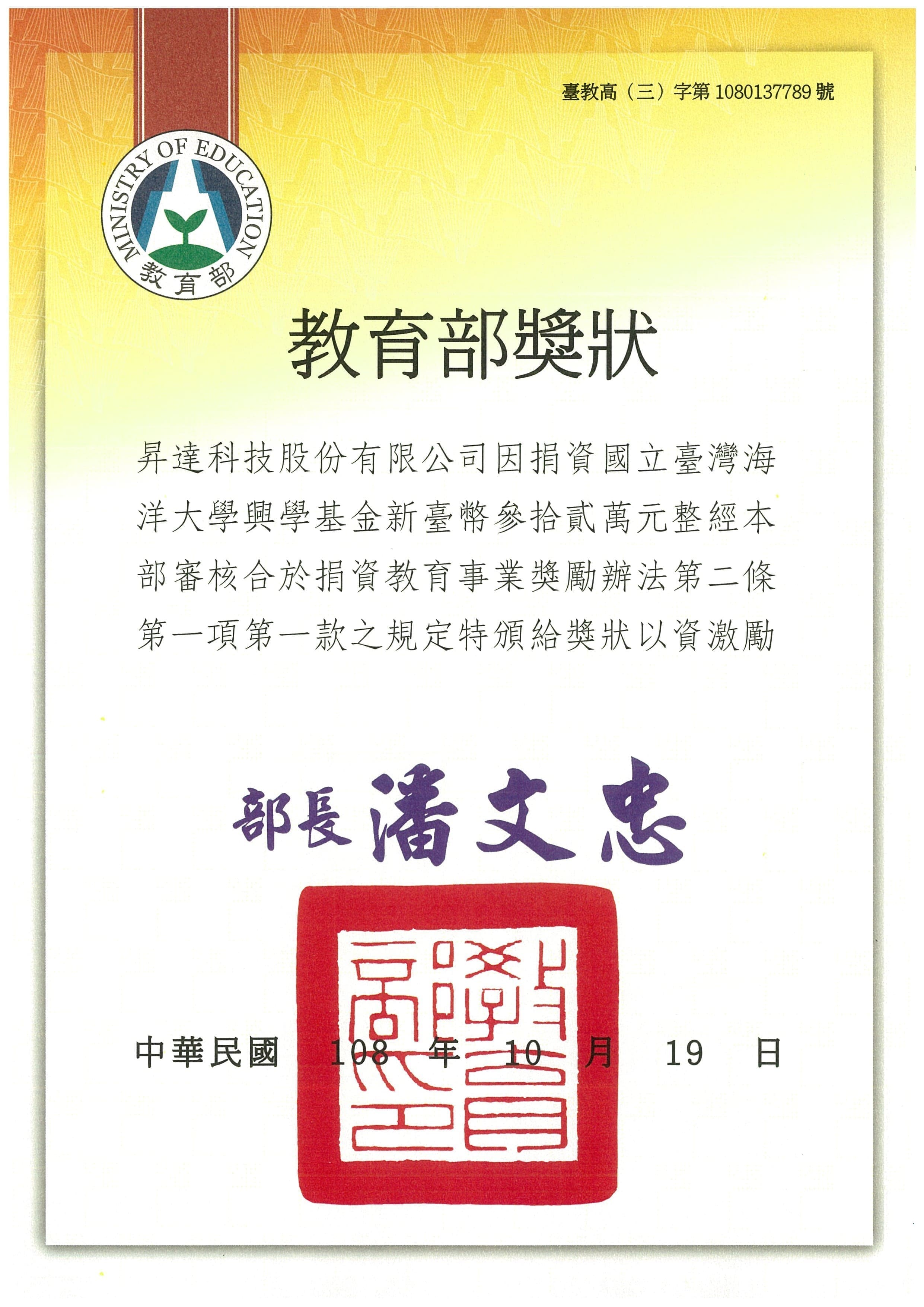 Donation of NT$120,000 to National Taiwan Ocean University for educational purposes. UMT was awarded by the Ministry of Education for this donation.