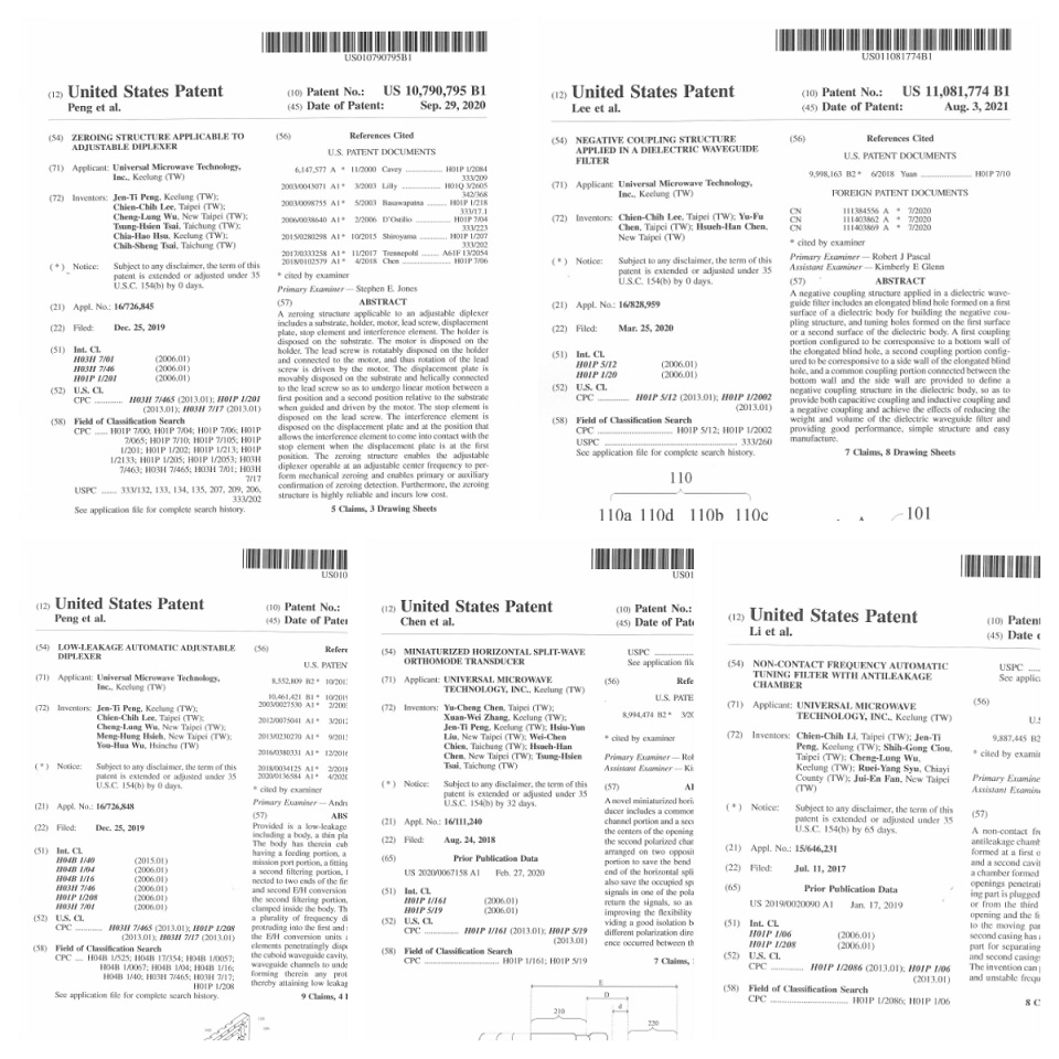 UMT has dedicated considerable time and effort along the time to the research and development of new communication technologies. In November 2020, UMT has just obtained the US Patent on Zeroing Structure Applicable to Adjustable Diplexer (valid 2019/12~2039/12).