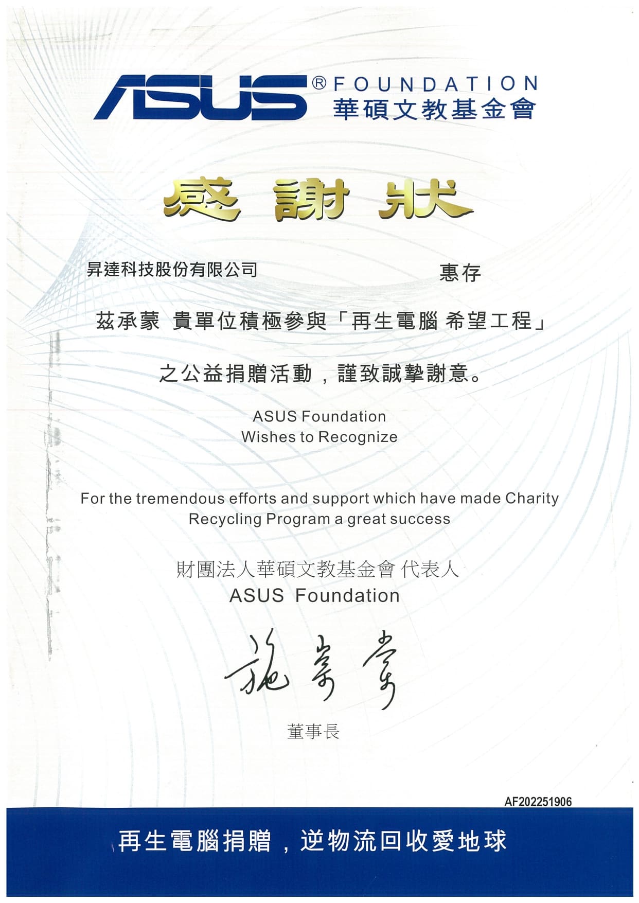 UMT has participated in the public welfare donation activity "Project Hope, Computer Recycling" held by ASUS Foundation. We have doanted many computer equipment which were refurbished by the Foundation and donated to socially vulnerable groups. Action from which, UMT was awarded a Certificate of Appreciation.