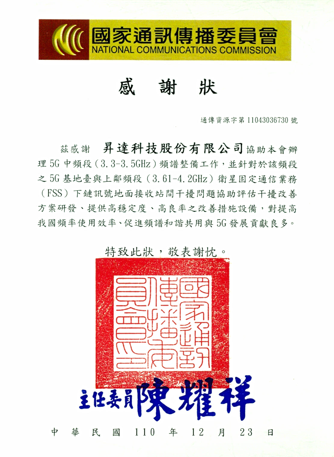 UMT's expertise in wireless communication is highly respected by the industry. Recently, UMT has been entrusted by the Taiwanese government to assist the preparations of 5G mid-band spectrum project, in order to improve interference problems in domestic satellite communications, increase stability and yield rate; thus ameliorate the efficiency of frequency use in the country, promote harmonious sharing of spectrum and 5G development. Basing on the above, NCC has awarded this Certification in gratitude of UMT's contributions.