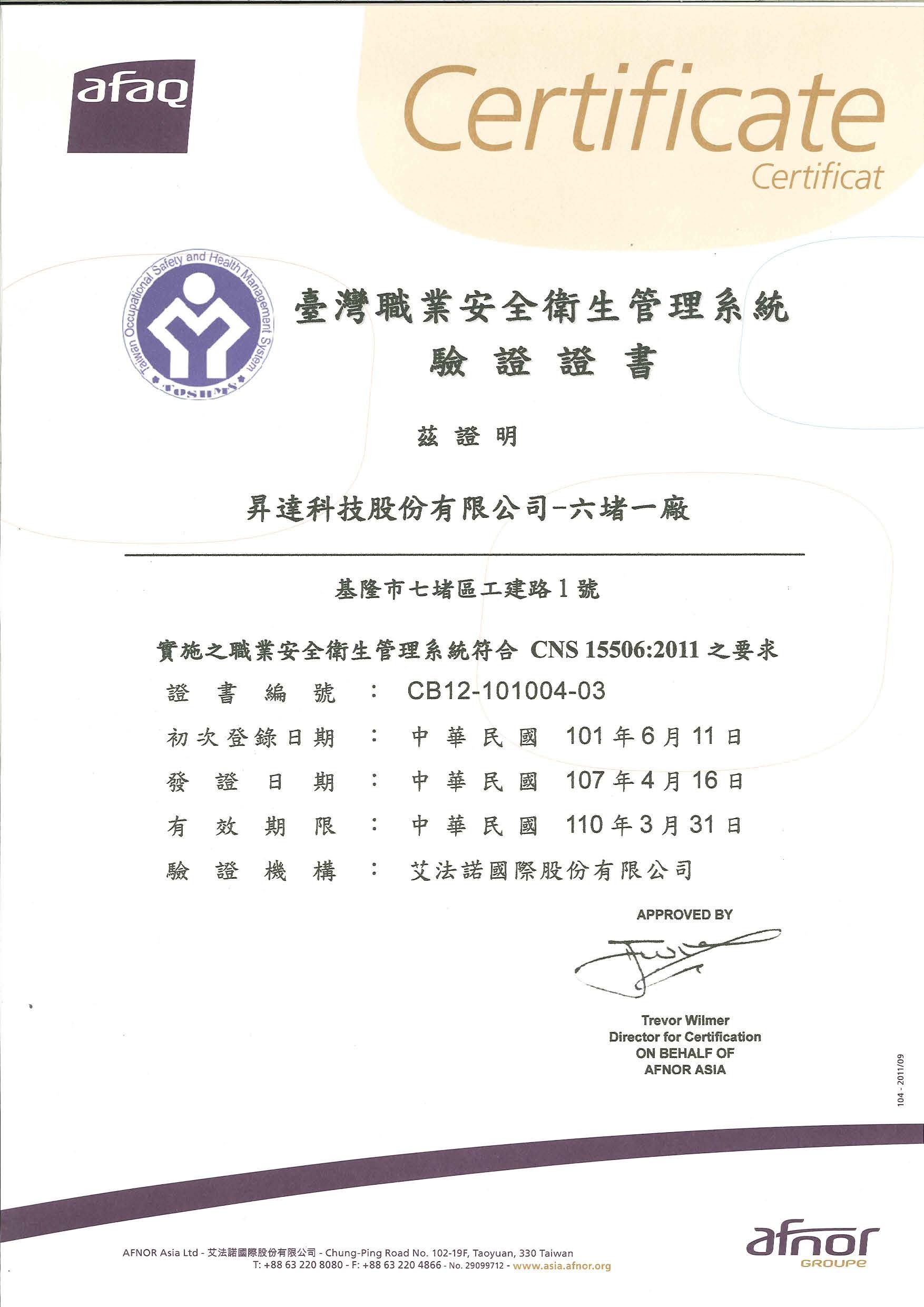 2018年4月取得CNS 15506職業安全衛生管理系統(2011版),證書有效期間:2018/4/16~2021/3/31。
